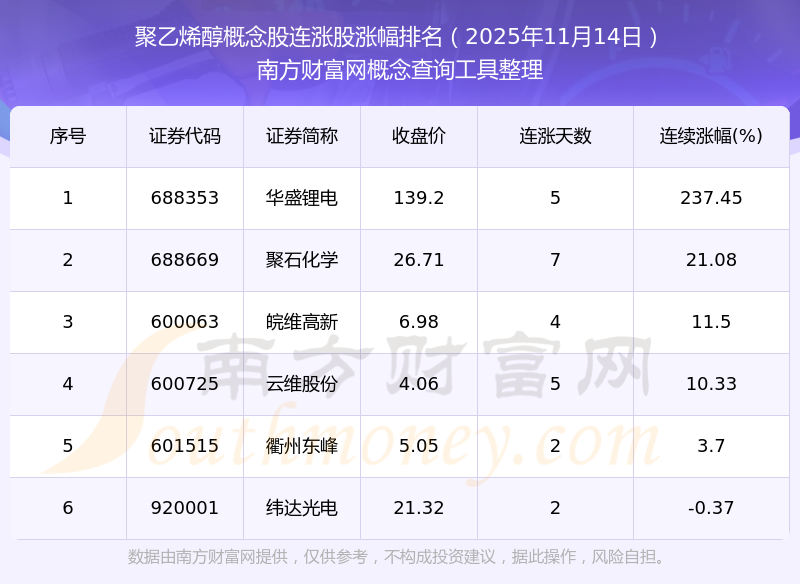 根據(jù)南方財(cái)富網(wǎng)概念查詢工具數(shù)據(jù)統(tǒng)計(jì),截止2025年11月14日收盤,聚乙烯醇概念股共有6只個(gè)股實(shí)現(xiàn)連漲。其中連續(xù)漲幅較大的個(gè)股有華盛鋰電、聚石化學(xué)、皖維高新等,連續(xù)漲幅分別為237.45%、21.08%、11.50%。