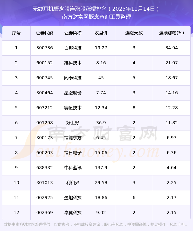 2025年11月14日無(wú)線耳機(jī)概念股連漲股漲幅排名