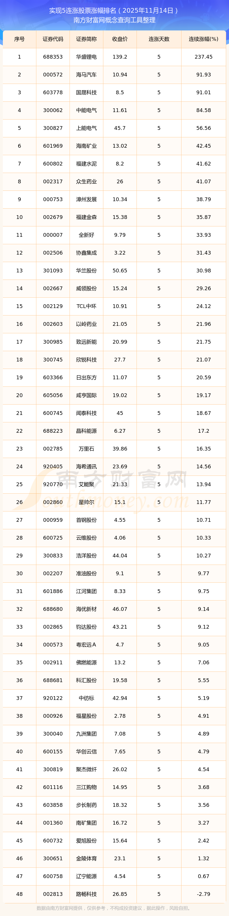 根據(jù)南方財(cái)富網(wǎng)概念查詢工具數(shù)據(jù)統(tǒng)計(jì),截止2025年11月14日收盤(pán),共有48只個(gè)股實(shí)現(xiàn)5天連漲。其中連續(xù)漲幅較大的個(gè)股有華盛鋰電、海馬汽車(chē)、國(guó)晟科技等,連續(xù)漲幅分別為237.45%、91.93%、91.01%。