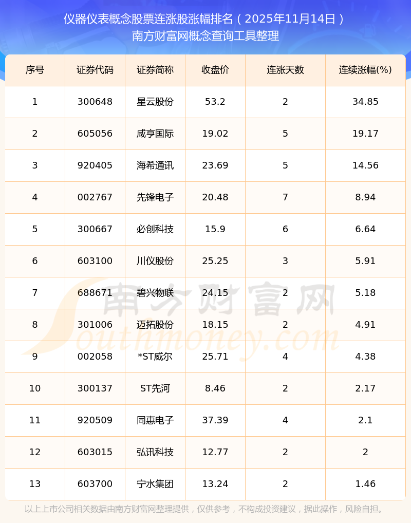 2025年11月14日儀器儀表概念股票連漲股漲幅排名