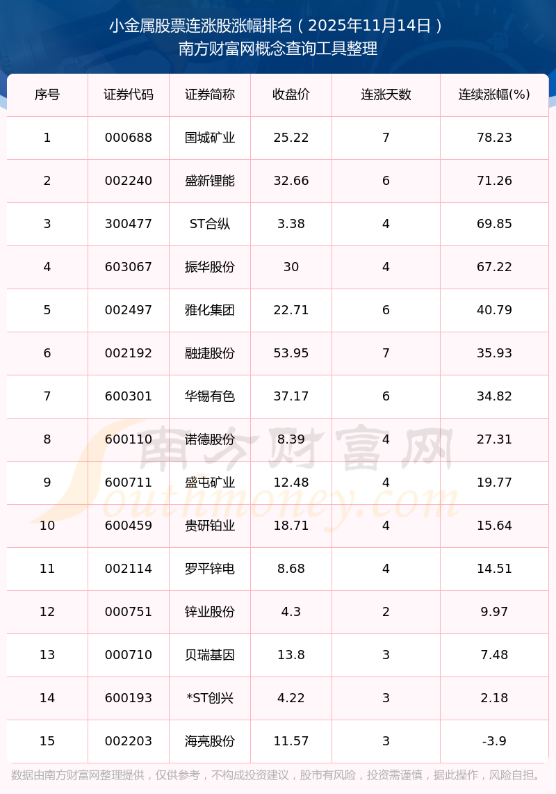 根據(jù)南方財富網(wǎng)概念查詢工具數(shù)據(jù)統(tǒng)計(jì),截止2025年11月14日收盤,小金屬股票共有15只個股實(shí)現(xiàn)連漲。其中連續(xù)漲幅較大的個股有國城礦業(yè)、盛新鋰能、ST合縱等,連續(xù)漲幅分別為78.23%、71.26%、69.85%。