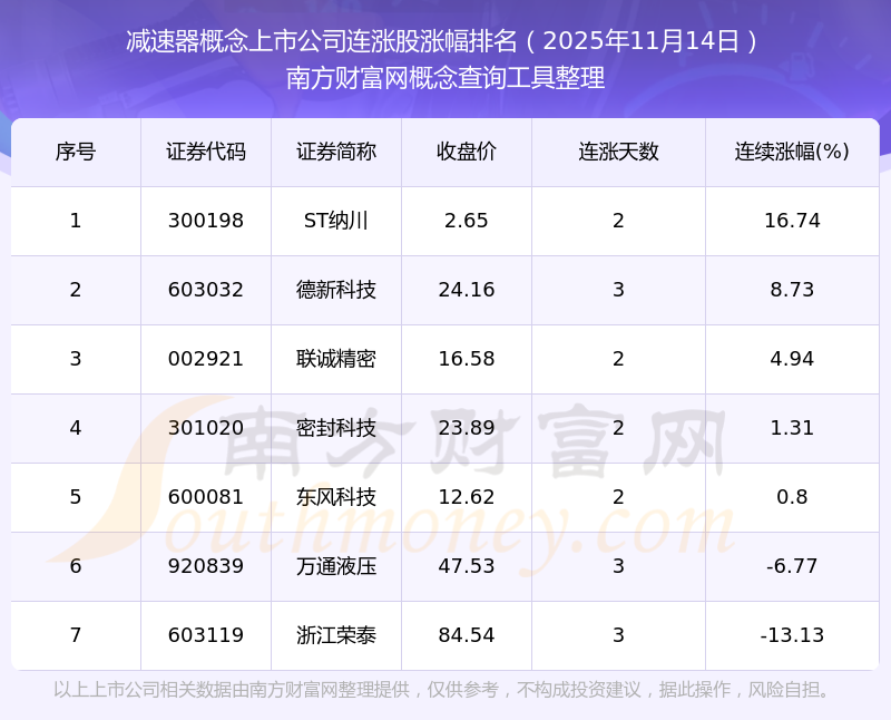 2025年11月14日減速器概念上市公司連漲股漲幅排名