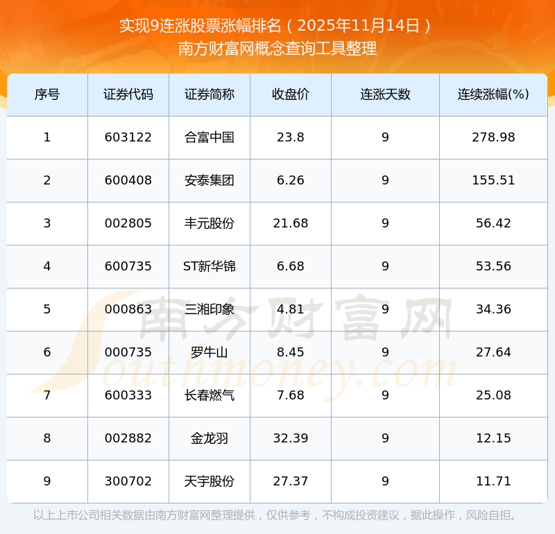2025年11月14日實(shí)現(xiàn)9連漲股票漲幅排名