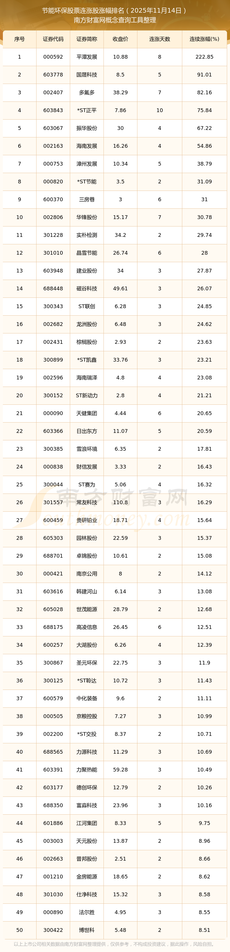 2025年11月14日節(jié)能環(huán)保股票連漲股漲幅排名