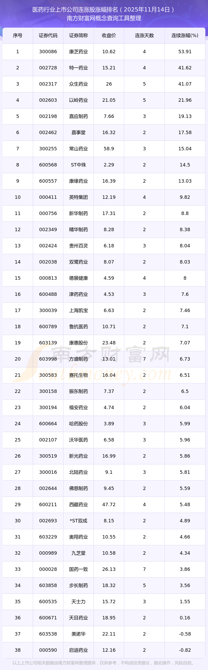 2025年11月14日醫(yī)藥行業(yè)上市公司連漲股漲幅排名