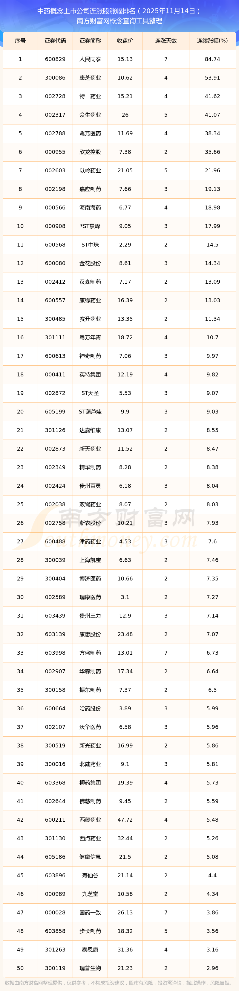 2025年11月14日中藥概念上市公司連漲股漲幅排名