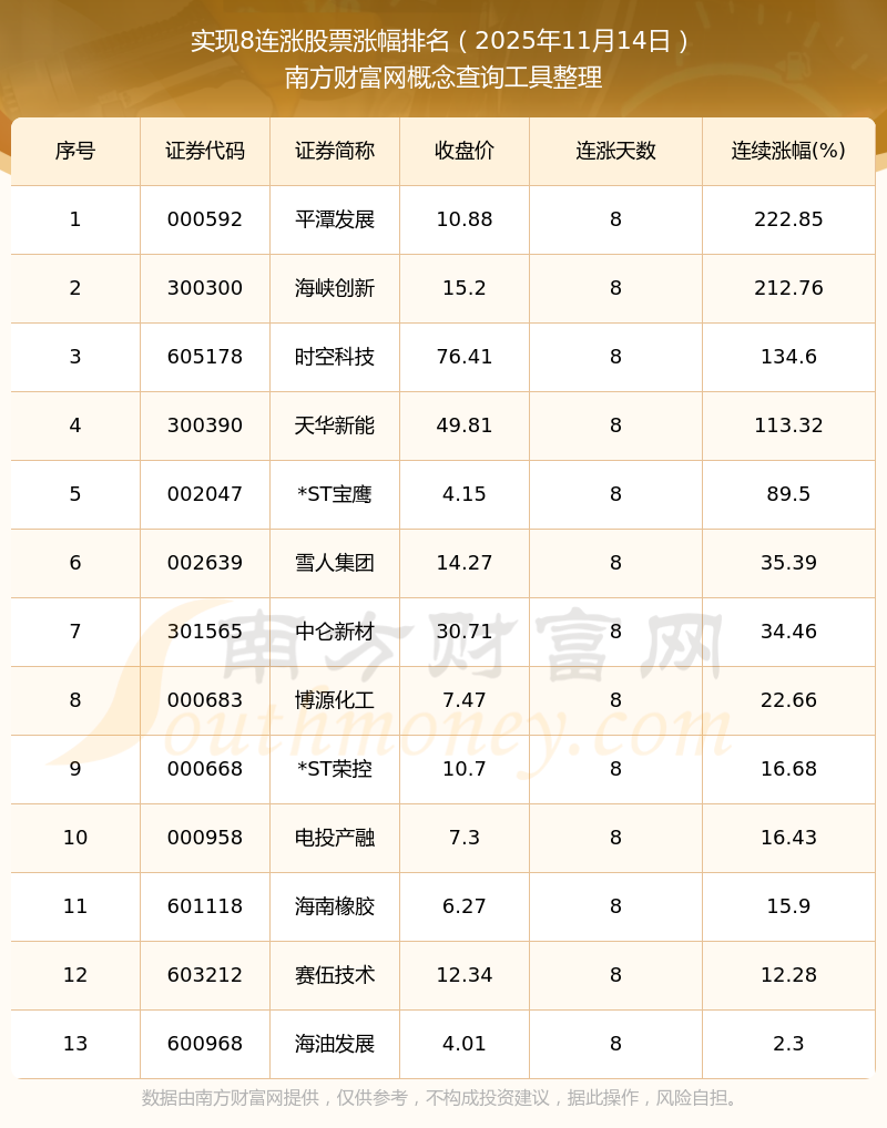 根據(jù)南方財(cái)富網(wǎng)概念查詢(xún)工具數(shù)據(jù)統(tǒng)計(jì),截止2025年11月14日收盤(pán),共有13只個(gè)股實(shí)現(xiàn)8天連漲。其中連續(xù)漲幅較大的個(gè)股有平潭發(fā)展、海峽創(chuàng)新、時(shí)空科技等,連續(xù)漲幅分別為222.85%、212.76%、134.60%。