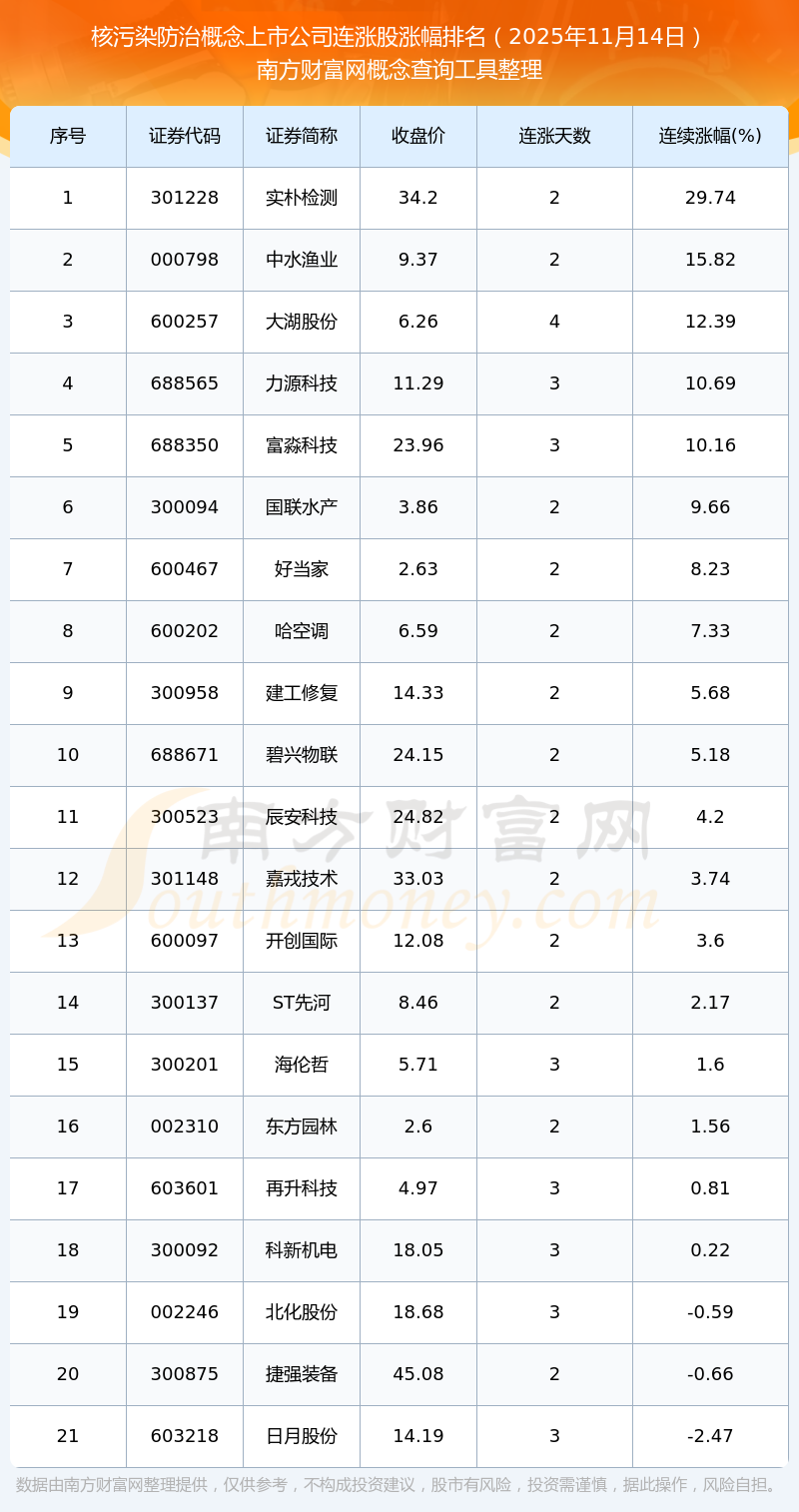 2025年11月14日核污染防治概念上市公司連漲股票漲幅排名