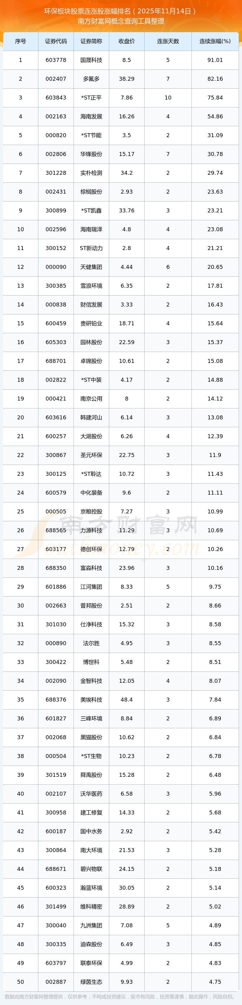 2025年11月14日環(huán)保板塊股票連漲股漲幅排名