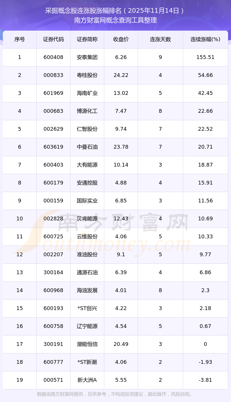 根據(jù)南方財富網(wǎng)概念查詢工具數(shù)據(jù)統(tǒng)計,截止2025年11月14日收盤,采掘概念股共有19只個股實現(xiàn)連漲。其中連續(xù)漲幅較大的個股有安泰集團、粵桂股份、海南礦業(yè)等,連續(xù)漲幅分別為155.51%、54.66%、42.45%。