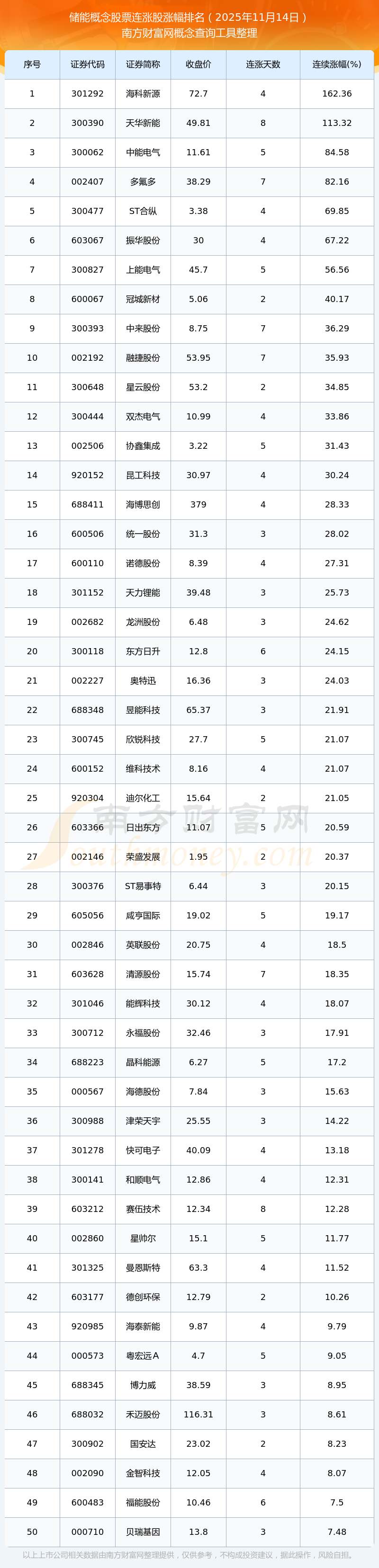 2025年11月14日儲(chǔ)能概念股票連漲股漲幅排名