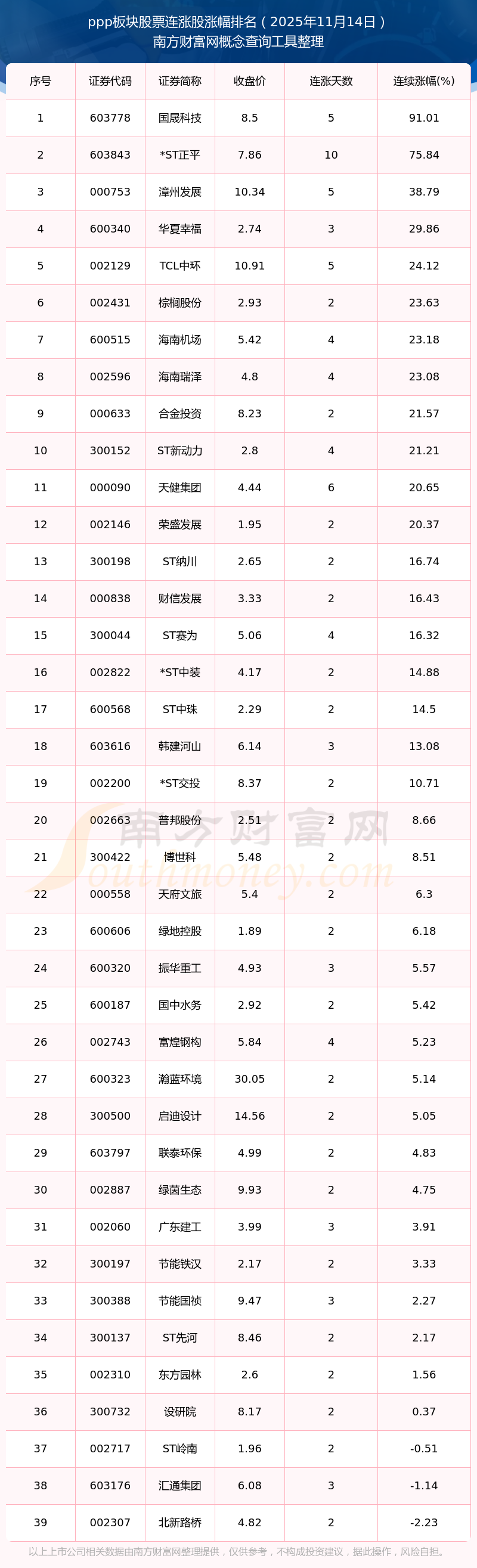 2025年11月14日ppp板塊股票連漲股漲幅排名