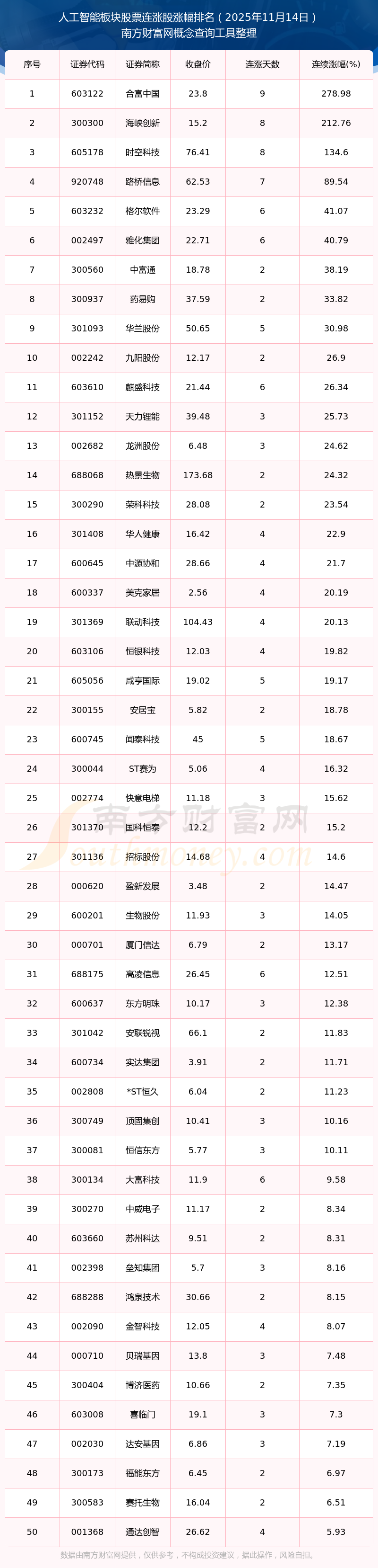 2025年11月14日人工智能板塊股票連漲股漲幅排名