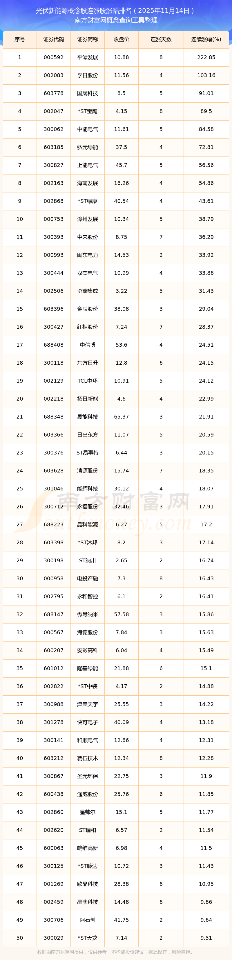 2025年11月14日光伏新能源概念股連漲股漲幅排名