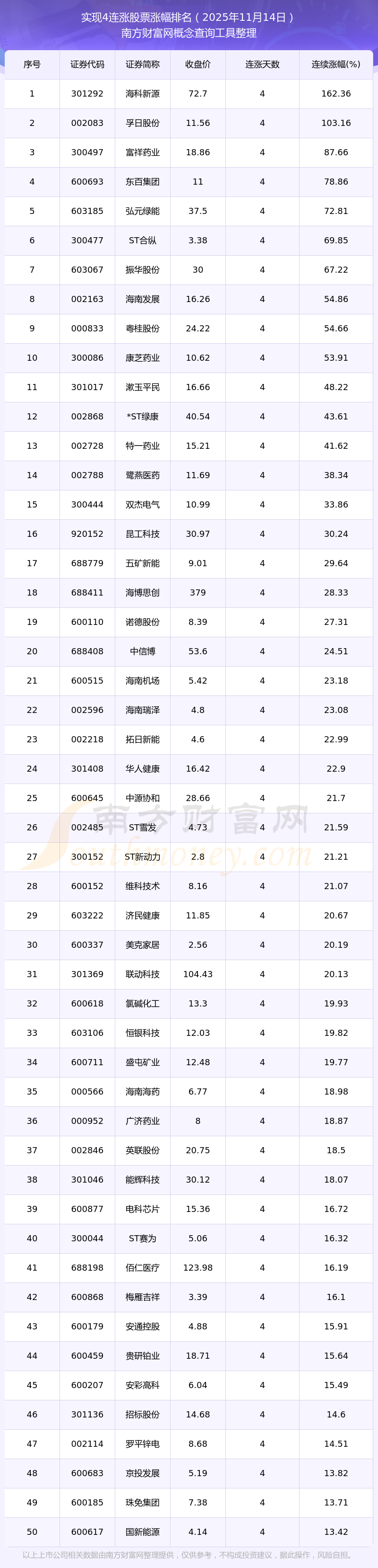 根據(jù)南方財富網(wǎng)概念查詢工具數(shù)據(jù)統(tǒng)計(jì),截止2025年11月14日收盤,共有100只個股實(shí)現(xiàn)4天連漲。其中連續(xù)漲幅較大的個股有?菩略础㈡谌展煞、富祥藥業(yè)等,連續(xù)漲幅分別為162.36%、103.16%、87.66%。