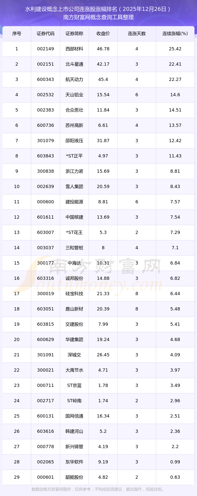 2025年12月26日水利建設(shè)概念上市公司連漲股漲幅排名