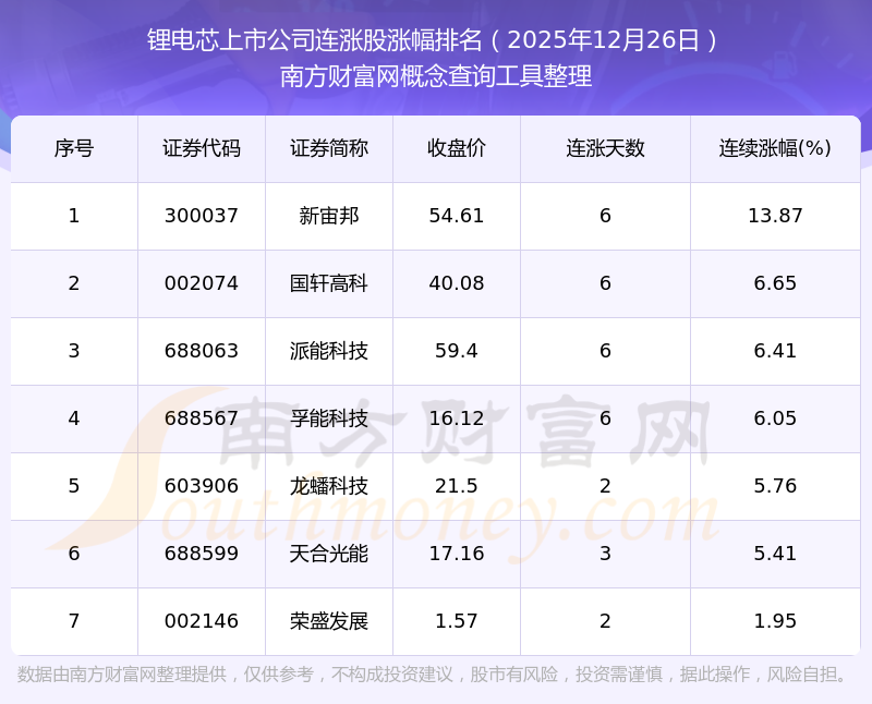 根據(jù)南方財富網(wǎng)概念查詢工具數(shù)據(jù)統(tǒng)計,截止2025年12月26日收盤,鋰電芯上市公司共有7只個股實現(xiàn)連漲。其中連續(xù)漲幅較大的個股有新宙邦、國軒高科、派能科技等,連續(xù)漲幅分別為13.87%、6.65%、6.41%。