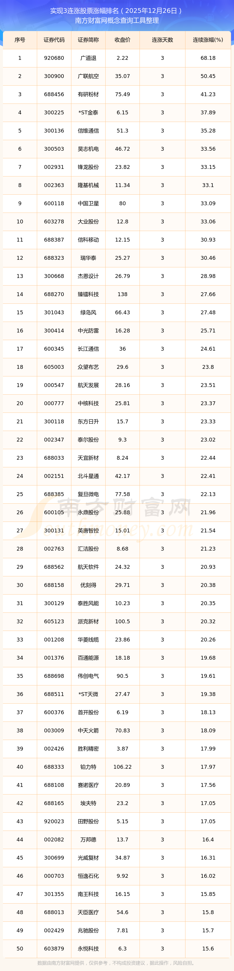 根據(jù)南方財富網(wǎng)概念查詢工具數(shù)據(jù)統(tǒng)計,截止2025年12月26日收盤,共有727只個股實現(xiàn)3天連漲。其中連續(xù)漲幅較大的個股有廣道退、廣聯(lián)航空、有研粉材等,連續(xù)漲幅分別為68.18%、50.45%、41.23%。