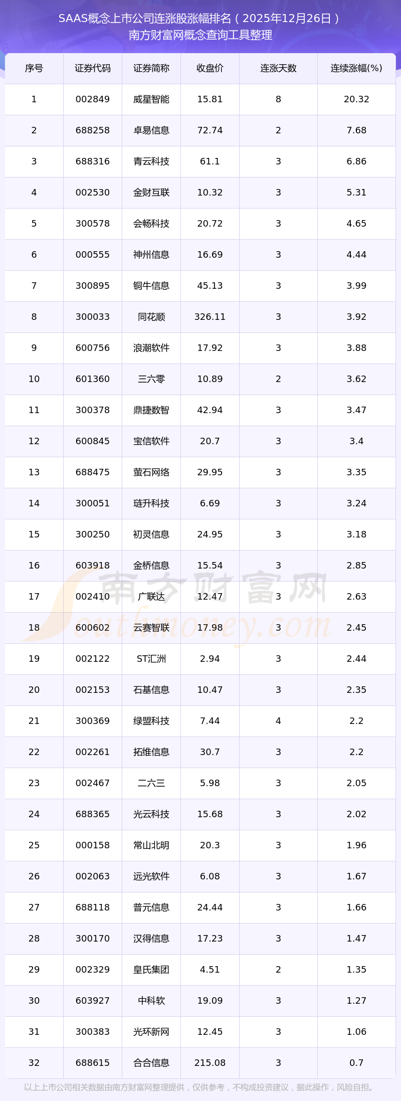 根據(jù)南方財(cái)富網(wǎng)概念查詢工具數(shù)據(jù)統(tǒng)計(jì),截止2025年12月26日收盤(pán),SAAS概念上市公司共有32只個(gè)股實(shí)現(xiàn)連漲。其中連續(xù)漲幅較大的個(gè)股有威星智能、卓易信息、青云科技等,連續(xù)漲幅分別為20.32%、7.68%、6.86%。