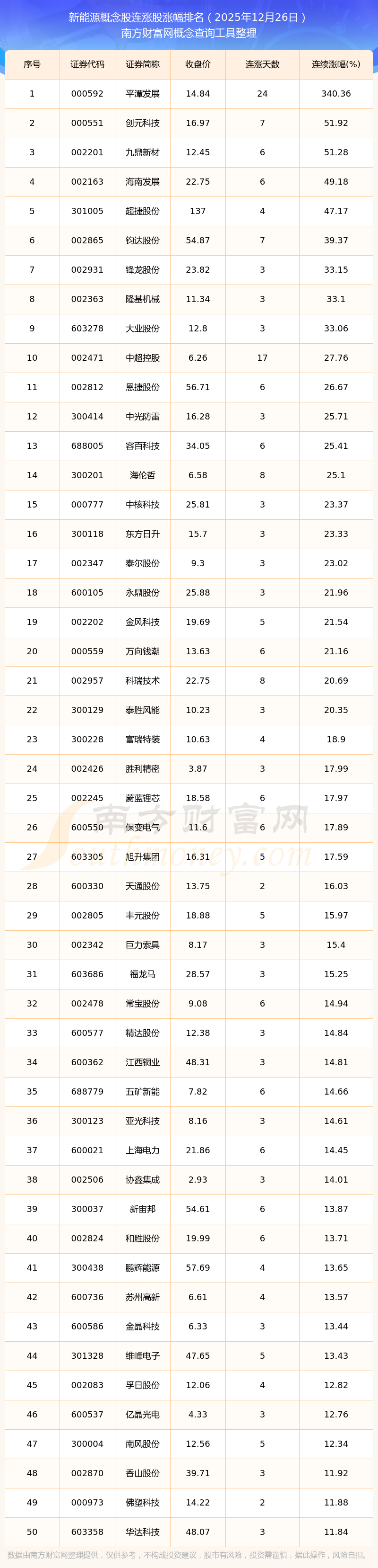 根據(jù)南方財(cái)富網(wǎng)概念查詢工具數(shù)據(jù)統(tǒng)計(jì),截止2025年12月26日收盤,新能源概念股共有231只個(gè)股實(shí)現(xiàn)連漲。其中連續(xù)漲幅較大的個(gè)股有平潭發(fā)展、創(chuàng)元科技、九鼎新材等,連續(xù)漲幅分別為340.36%、51.92%、51.28%。