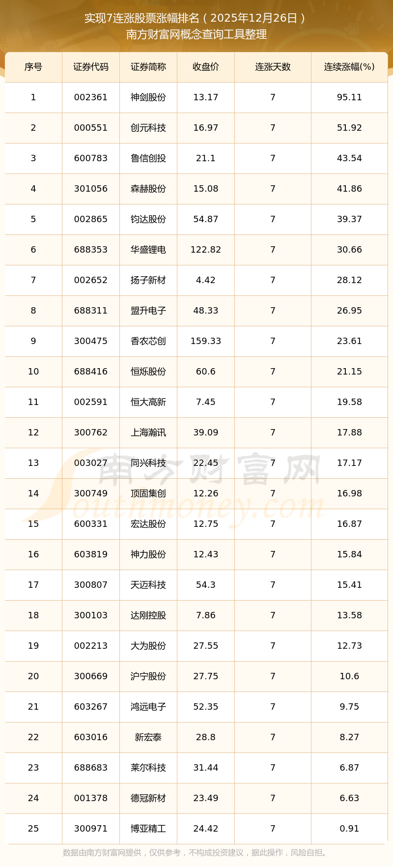 2025年12月26日實現(xiàn)7連漲股票漲幅排名