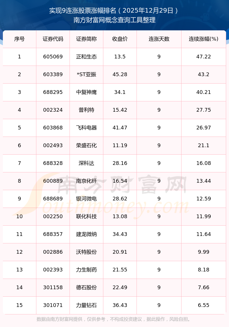 根據(jù)南方財(cái)富網(wǎng)概念查詢工具數(shù)據(jù)統(tǒng)計(jì),截止2025年12月29日收盤(pán),共有15只個(gè)股實(shí)現(xiàn)9天連漲。其中連續(xù)漲幅較大的個(gè)股有正和生態(tài)、*ST亞振、中復(fù)神鷹等,連續(xù)漲幅分別為47.22%、43.20%、40.21%。