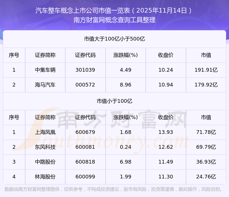 截止2025年11月14日,汽車整車概念上市公司中國機汽車、動力新科、錢江摩托、上海鳳凰等19家市值位于不足100億之列;北汽藍谷、春風動力、一汽解放、愛瑪科技等16家市值位于100億到500億之列;廣汽集團、宇通客車、千里科技等3家市值位于500億到1000億之列;長城汽車、上汽集團、長安汽車、江淮汽車等4家市值位于1000億到2000億之列;賽力斯市值位于2000億到5000億之列;比亞迪市值位于5000億到10000億之列;寧德時代市值位于大于10000億之列。