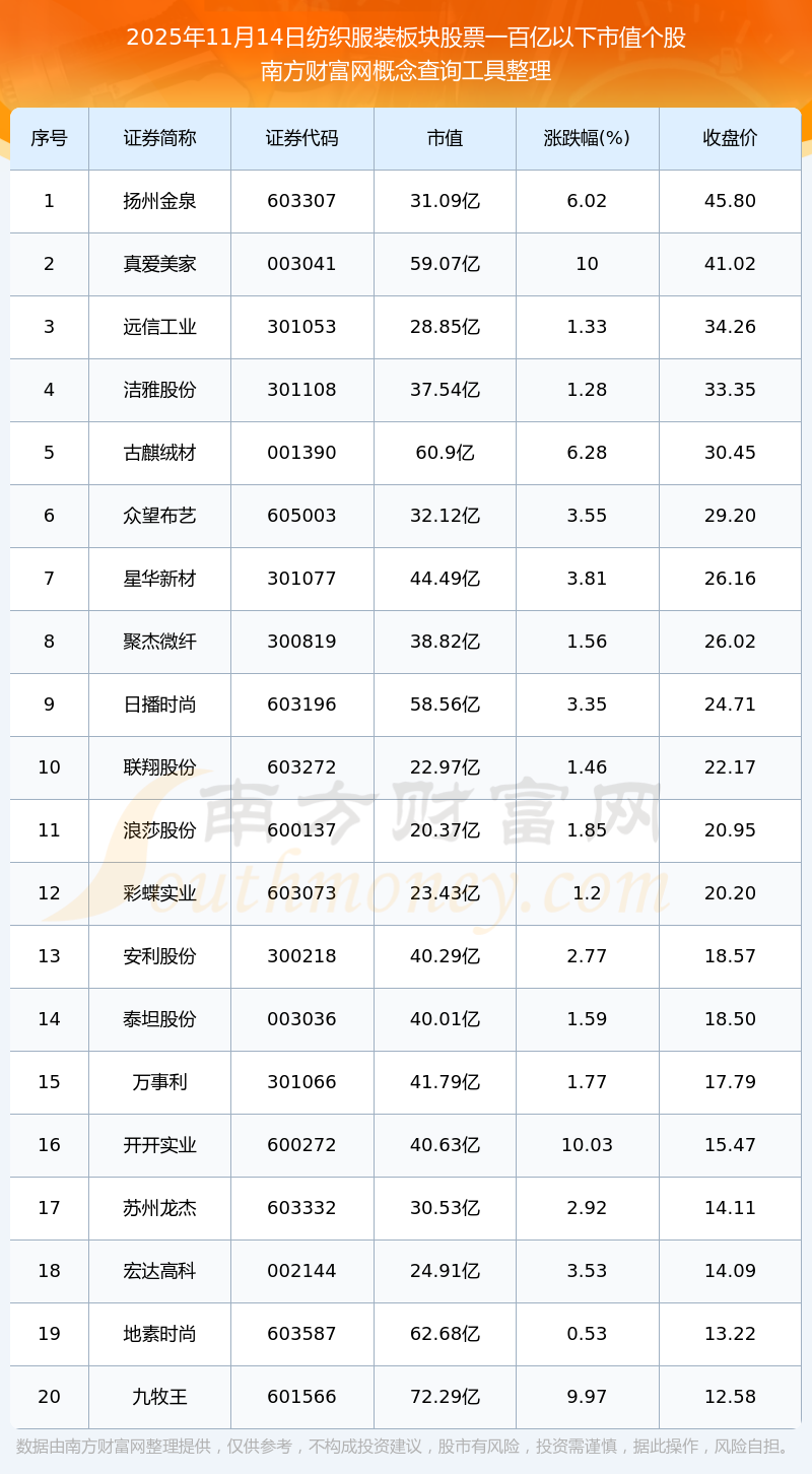 截止2025年11月14日,紡織服裝板塊股票市值一百億以下的個股共有36只。其中,市值較高的有德展健康、九牧王、紅豆股份,市值分別為96.26億元、72.29億元、64.85億元。