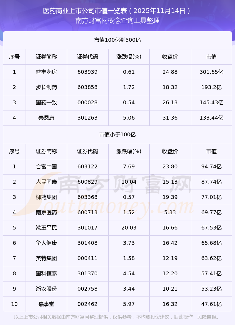 截止2025年11月14日,醫(yī)藥商業(yè)上市公司中國(guó)新健康、廣譽(yù)遠(yuǎn)、重藥控股、合富中國(guó)、中恒集團(tuán)等42家市值位于不足100億之列;同仁堂、白云山、益豐藥房、九州通等18家市值位于100億到500億之列;華東醫(yī)藥和上海醫(yī)藥市值位于500億到1000億之列。