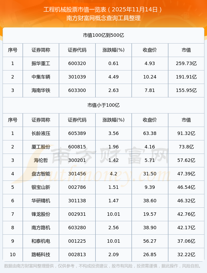 截止2025年11月14日,工程機(jī)械股票中華翔股份、福達(dá)股份、中際聯(lián)合、軟控股份、長(zhǎng)齡液壓等67家市值位于不足100億之列;杭叉集團(tuán)、鐵建重工、浙江鼎力、振華重工等25家市值位于100億到500億之列;時(shí)代電氣、中聯(lián)重科、賽輪輪胎等3家市值位于500億到1000億之列;三一重工、寶鋼股份、濰柴動(dòng)力等5家市值位于1000億到2000億之列。