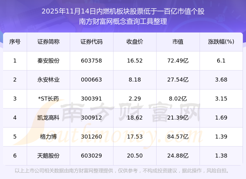截止2025年11月14日,內(nèi)燃機(jī)板塊股票市值低于一百億的個(gè)股共有6只。其中,市值較高的有格力博、秦安股份、永安林業(yè),市值分別為84.57億元、72.49億元、27.54億元。