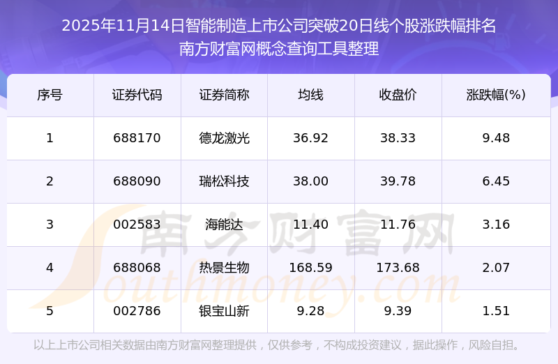 2025年11月14日智能制造上市公司突破20日線個(gè)股漲跌幅排名