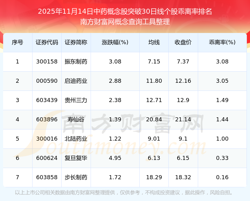 根據(jù)南方財富網(wǎng)概念查詢工具數(shù)據(jù)統(tǒng)計,截止2025年11月14日收盤,中藥概念股共有7只個股收盤價向上突破了30日線。其中乖離率較大的個股有振東制藥、啟迪藥業(yè)、貴州三力等,乖離率分別為3.08%、3.05%、1.49%。