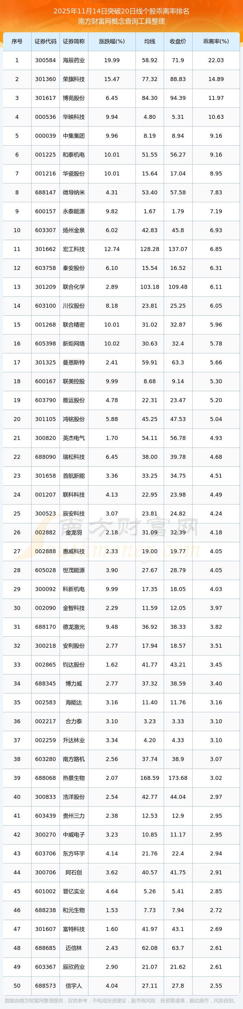 根據(jù)南方財富網(wǎng)概念查詢工具數(shù)據(jù)統(tǒng)計,截止2025年11月14日收盤,共有108只個股收盤價向上突破了20日線,其中乖離率較大的個股有海辰藥業(yè)、榮旗科技、博苑股份、華映科技、中集集團(tuán)等,乖離率分別為22.03%、14.89%、11.97%、10.63%、9.16%。