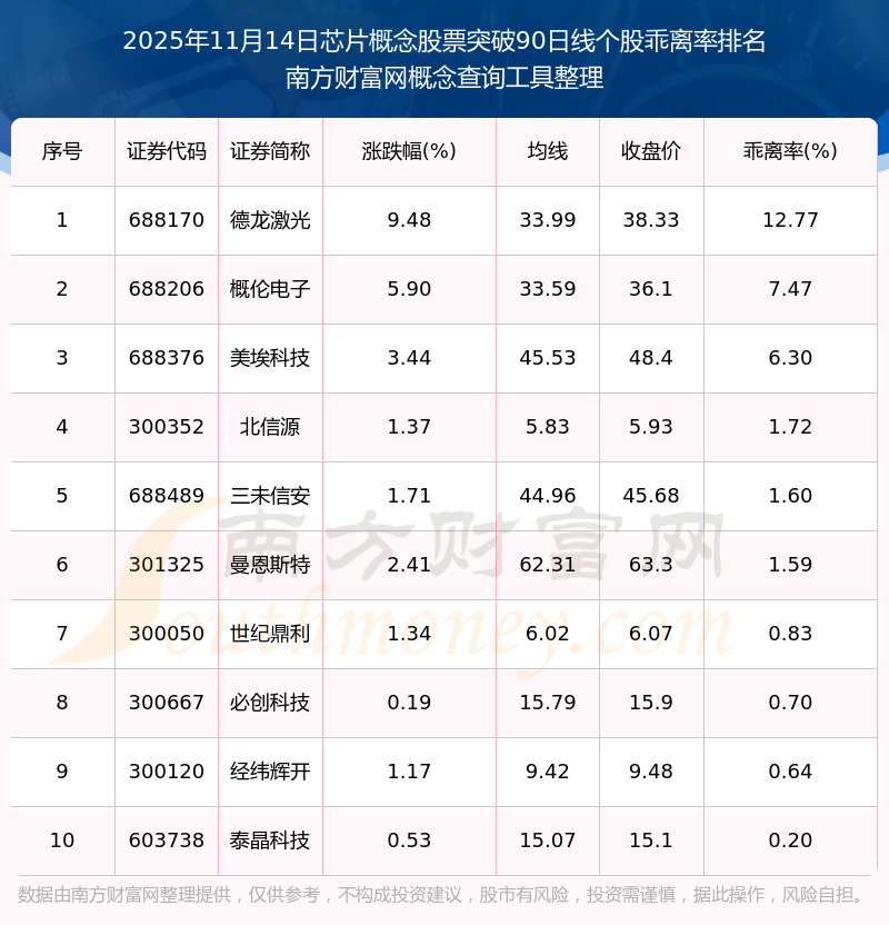 2025年11月14日芯片概念股票突破90日線個(gè)股乖離率排名
