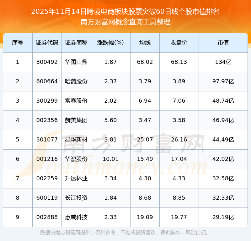 2025年11月14日跨境電商板塊股票突破60日線個(gè)股市值排名