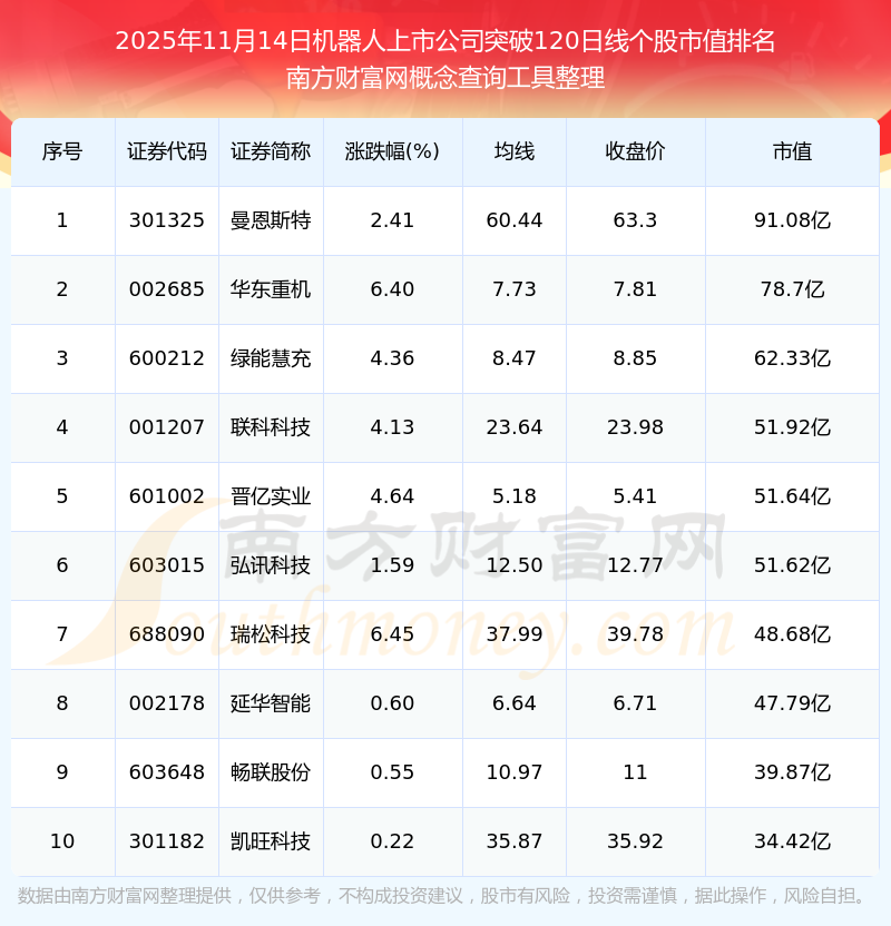 根據(jù)南方財富網(wǎng)概念查詢工具數(shù)據(jù)統(tǒng)計,截止2025年11月14日收盤,機器人上市公司共有13只個股收盤價向上突破了120日線。其中市值較大的個股有曼恩斯特、華東重機、綠能慧充等,市值分別為91.08億、78.7億、62.26億。
