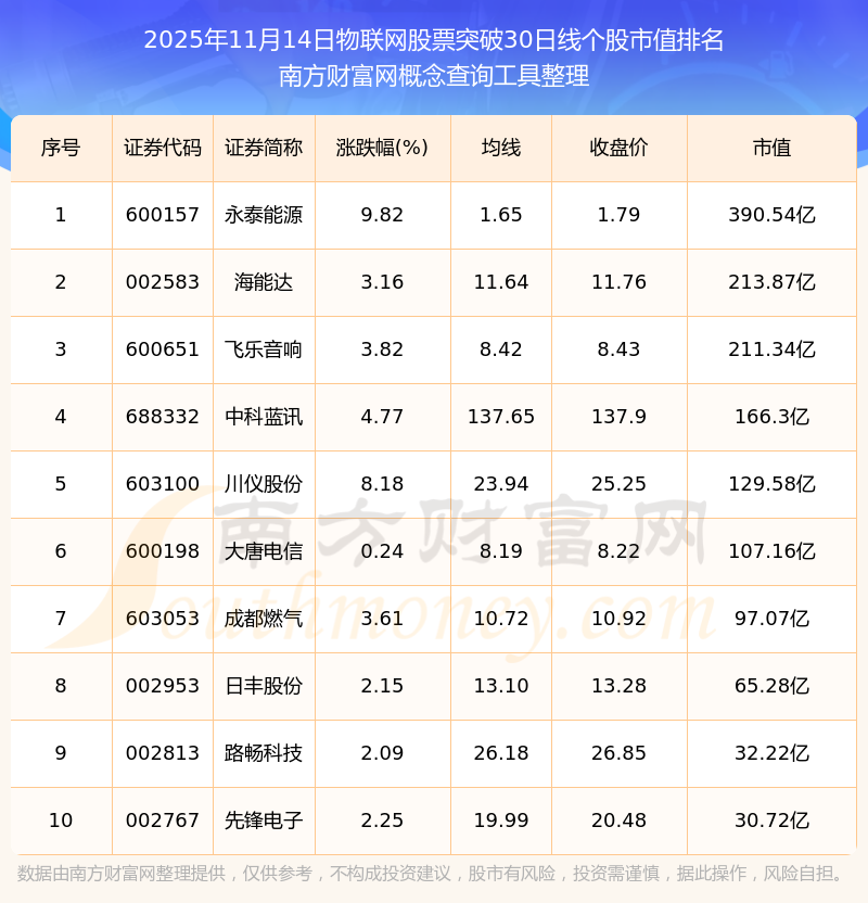 2025年11月14日物聯(lián)網(wǎng)股票突破30日線個(gè)股市值排名