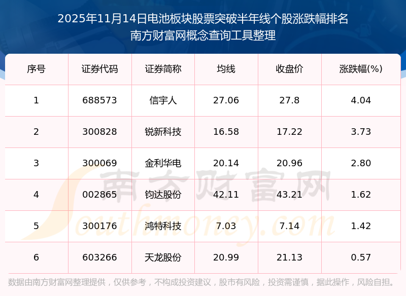 2025年11月14日電池板塊股票突破半年線個(gè)股漲跌幅排名