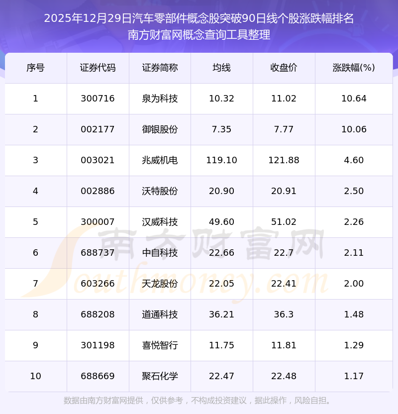 根據(jù)南方財富網(wǎng)概念查詢工具數(shù)據(jù)統(tǒng)計,截止2025年12月29日收盤,汽車零部件概念股共有17只個股收盤價向上突破了90日線。其中漲幅較大的個股有泉為科技、御銀股份、兆威機(jī)電等,漲幅分別為10.64%、10.06%、4.60%。