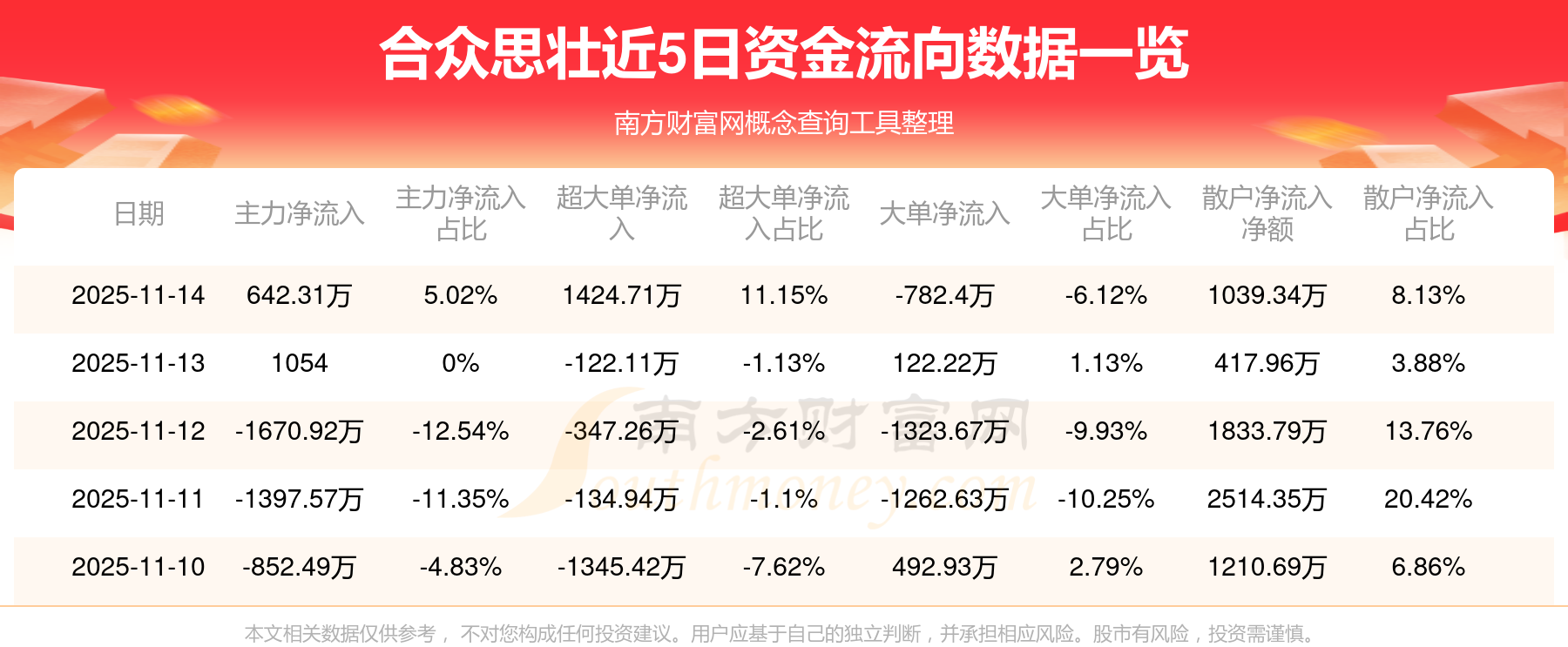 11月14日消息,合眾思壯11月14日主力凈流入642.31萬元,超大單凈流入1424.71萬元,大單凈流出782.4萬元,散戶凈流入1039.34萬元。