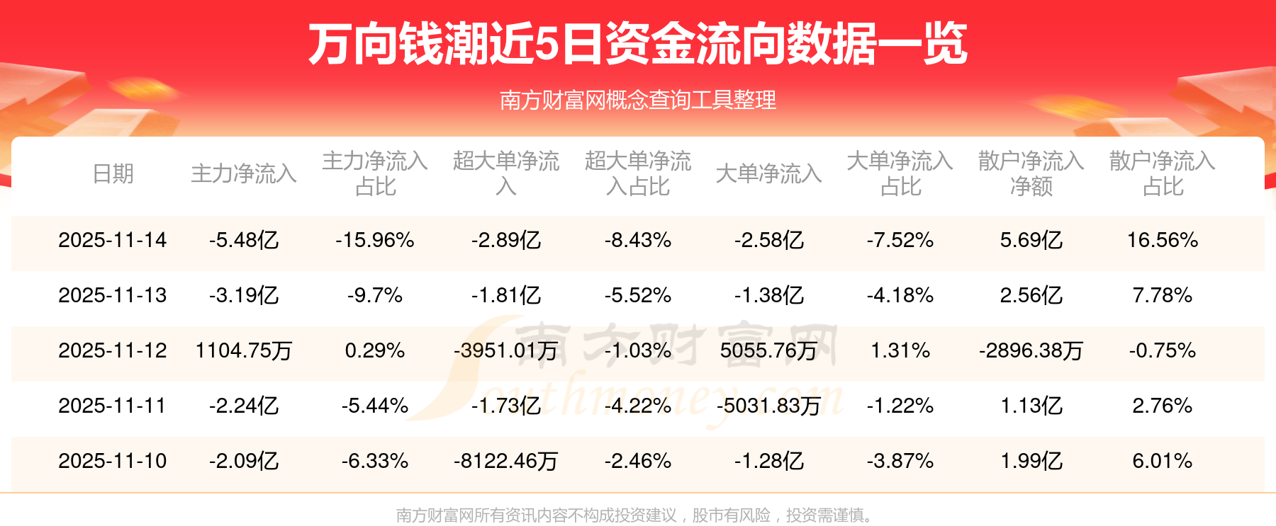 11月14日消息,萬向錢潮11月14日主力資金凈流出5.48億元,超大單資金凈流出2.89億元,大單資金凈流出2.58億元,散戶資金凈流入5.69億元。