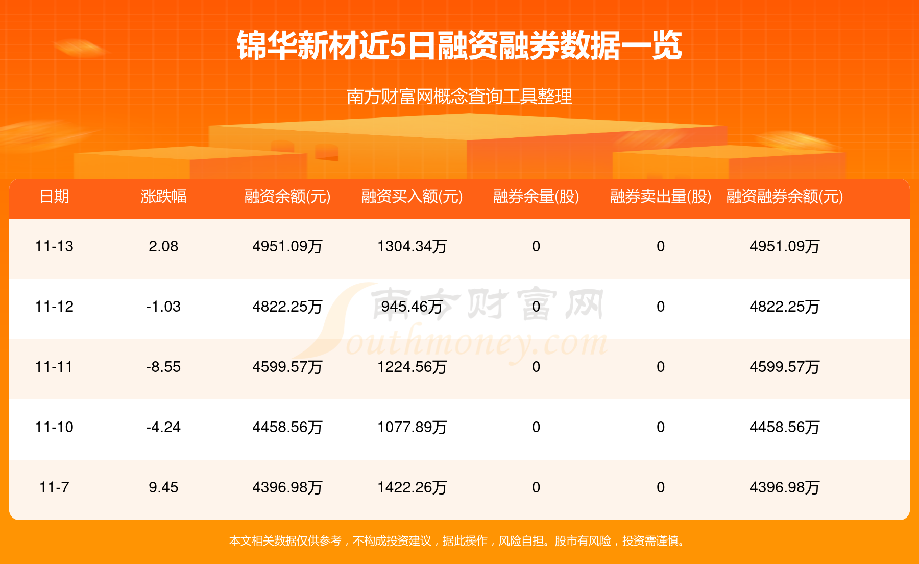 11月13日錦華新材融券信息顯示,融資方面,當(dāng)日融資買入1304.34萬元,融資償還1175.5萬元,融資凈買額128.84萬元。近5日融資融券數(shù)據(jù)一覽見下表: