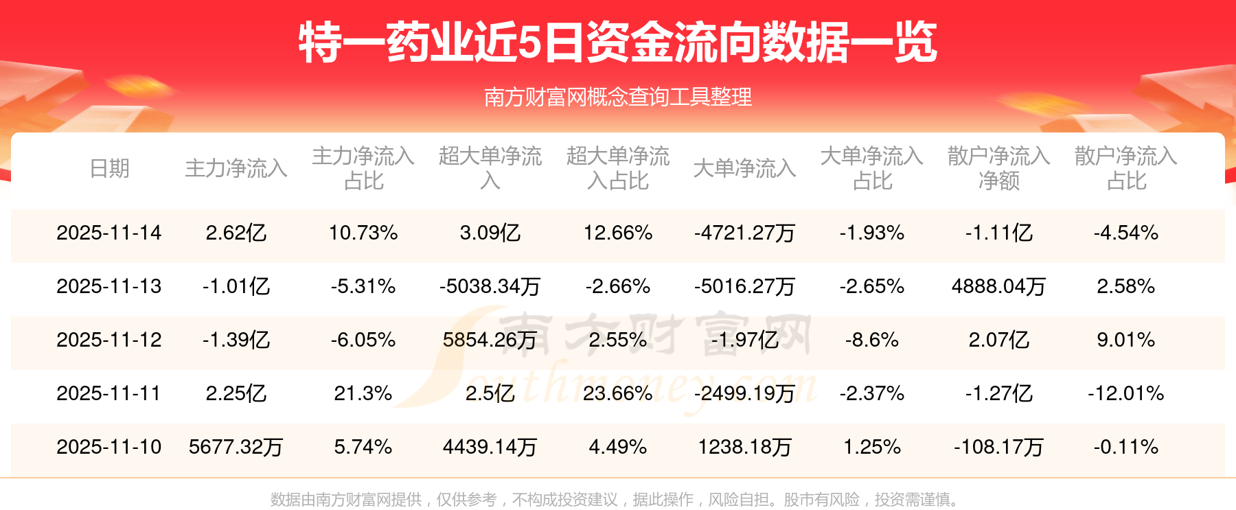 11月14日消息,特一藥業(yè)11月14日主力凈流入2.62億元,超大單凈流入3.09億元,大單凈流出4721.27萬元,散戶凈流出1.11億元。