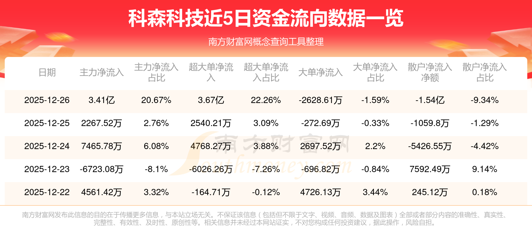 12月26日消息,科森科技主力資金凈流入3.41億元,超大單資金凈流入3.67億元,散戶資金凈流出1.54億元。