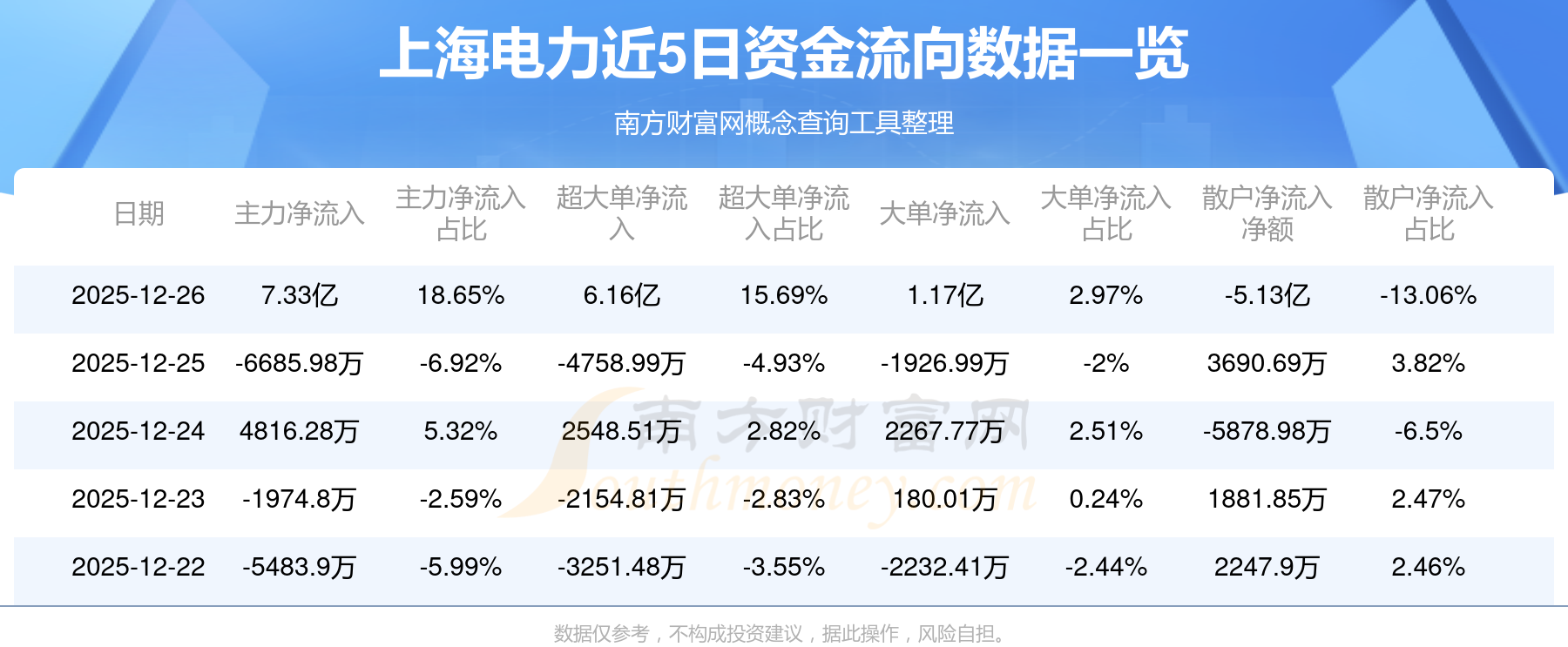 12月26日消息,上海電力資金凈流入7.33億元,超大單凈流入6.16億元,換手率6.59%,成交金額39.29億元。