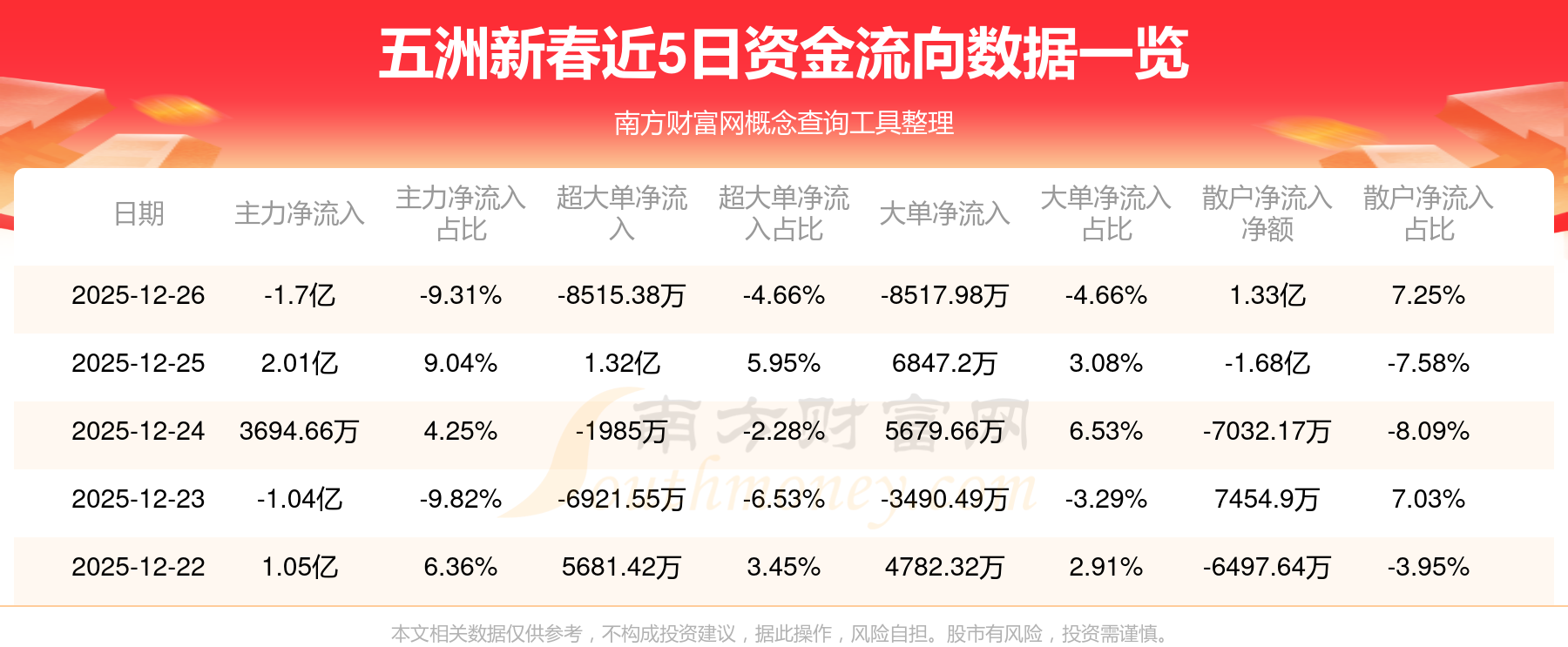 北京時間12月26日,五洲新春開盤報價52.3元,收盤于52.580元,相比上一個交易日的收盤跌0.7%報52.95元。當日最高價53.88元,最低達51.81元,成交量3482.14萬手,總市值192.55億元。