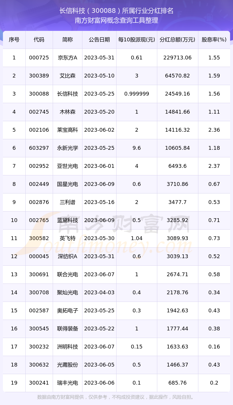 按照南方財富網(wǎng)趨勢選股系統(tǒng)統(tǒng)計,長信科技所屬行業(yè)為光學光電子行業(yè),光學光電子行業(yè)分紅排名情況如下表: