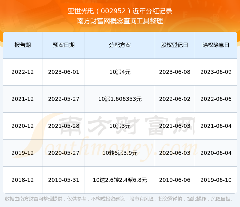 亞世光電最新一次公布的分紅方案:10派4元。