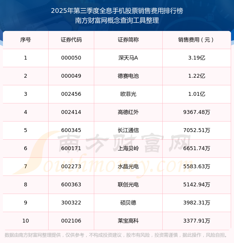 2025年第三季度,全息手機(jī)股票銷售費(fèi)用排行榜如下:深天馬A(000050)的銷售費(fèi)用總額高達(dá)3.19億,德賽電池(000049)和歐菲光(002456)分別排名第二和第三,高德紅外(002414)、長(zhǎng)江通信(600345)、上海貝嶺(600171)、水晶光電(002273)、聯(lián)創(chuàng)光電(600363)、碩貝德(300322)、萊寶高科(002106)分別進(jìn)入前十,其銷售費(fèi)用總額分別排名第4-10名。